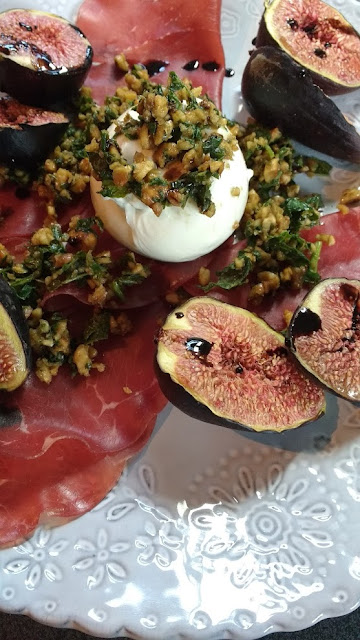 Arrange the bresaola and burrata on a plate, tip the hazelnut rubble onto the plate and add the hot figs. Drizzle with a little extra balsamic. A glass of fino sherry would be particularly nice with this, but I didn't happen to have one.